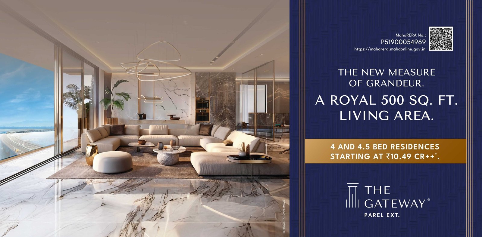 Standing tall amidst the grandiose skyline of South Mumbai, The Gateway, is the epitome of sophistication and opulence. Enter the gateway of luxury with 3, 4 and 4.5 BHK apartments in Parel ext. that face the ocean, offering uninterrupted views of the Arabian Sea as well as the world-renowned mudflats. Elevate your lifestyle with a large variety of indoor and outdoor amenities and live life to the fullest with the spacious clubhouse. A rare opportunity awaits those who will soon call these distinguished homes their own.